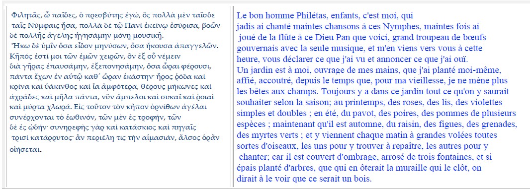 Au début du livre II, Daphnis et Chloé rencontrent un vieillard, nommé Philétas. Celui-ci, sous forme de fable, entreprend de leur montrer qu’ils sont voués à l’amour. La traduction proposée est de Paul-Louis Courier.