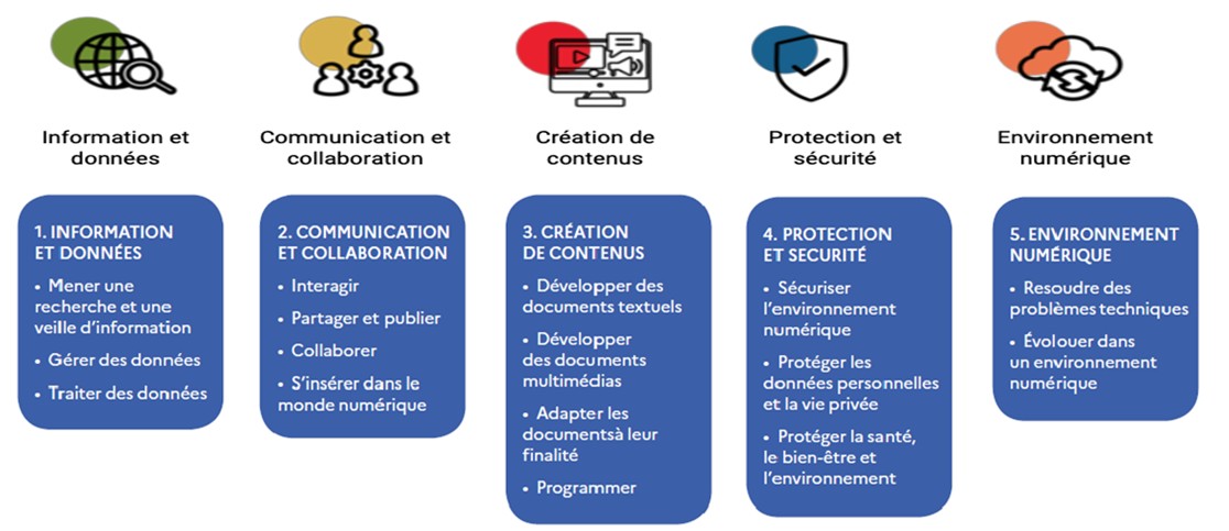 Le Cadre de Référence des Compétence Numérique rassemble et organise de façon progressive les 16 compétences numériques développées de l’école élémentaire à l’université, ainsi que dans le contexte de la formation continue des adultes.