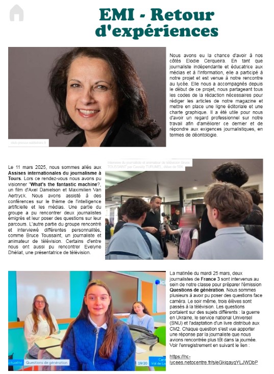 - Découvrir, par la réalisation d’un magazine numérique, la presse écrite (fabrique de l’information, vérification des sources, ligne éditoriale, charte graphique). Découvrir les grands enjeux et la nécessité de développer un esprit critique à l’heure des deepfakes notamment.