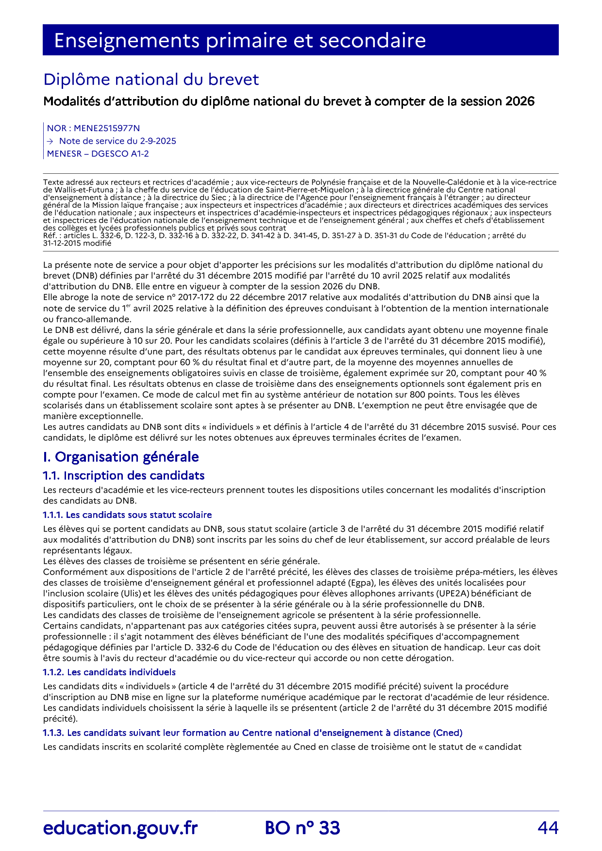 Cet article rassemble l’ensemble des textes officiels en vigueur concernant le DNB de la session 2026.