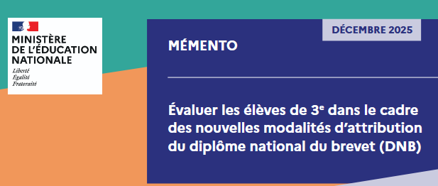 Mémento "Évaluer les élèves de 3e dans le cadre des nouvelles modalités d’attribution du diplôme national du brevet (DNB) - Décembre 2025" (Source : Éduscol)