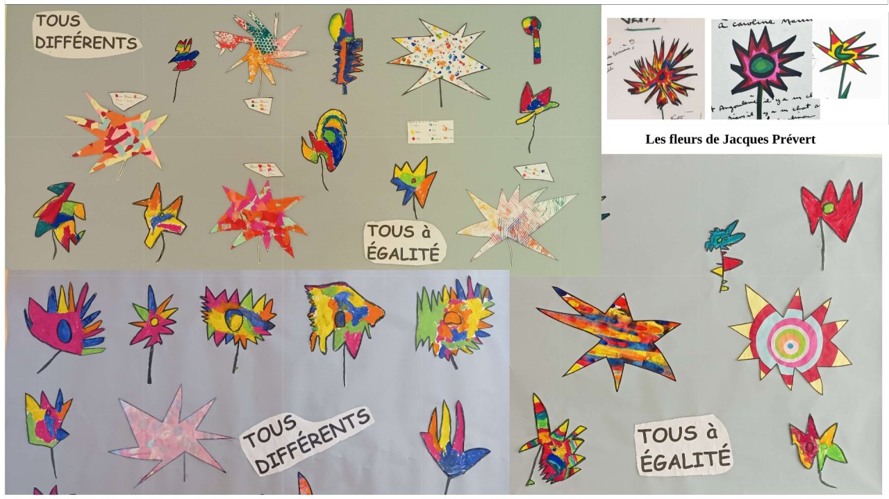 Les élèves ont réalisé une production artistique inspirée des “Fleurs” de Jacques Prévert, symbole de paix et d’humanité.