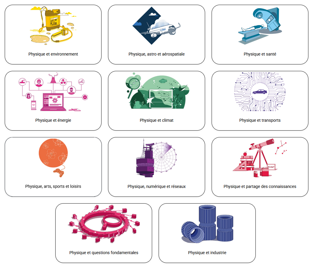 La plaquette présente onze grandes thématiques : environnement, astrophysique et aérospatiale, santé, énergie, climat, transport, arts, sports et loisirs, numérique et réseaux, partage des connaissances, questions fondamentales et industrie.