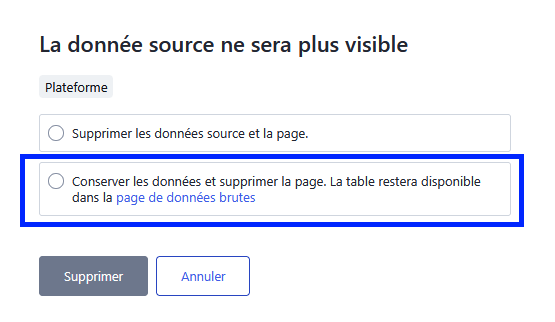 - Vous pouvez supprimer cette table des pages visibles, mais garder les données. La table sera alors visible dans la page des données brutes.