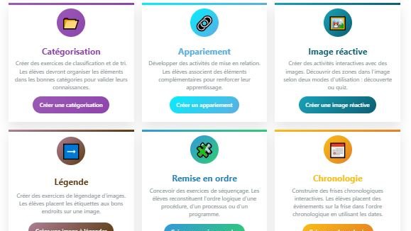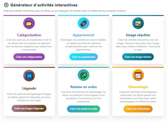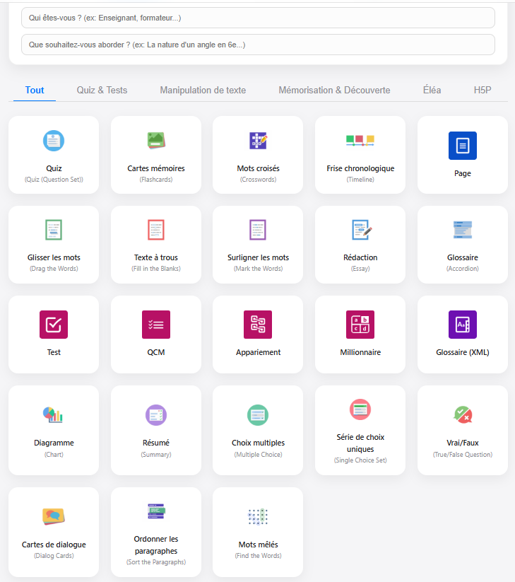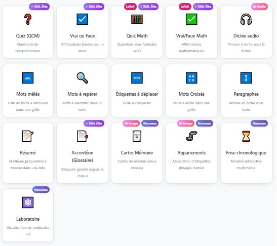 En mode "sans IA", l’application permet de générer également des activités (modules SCORM) type catégorisation, appariement, chronologie, ...