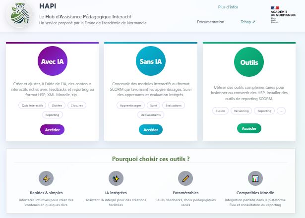 HAPI est un outil développé par la DRANE de Normandie, conçu pour automatiser la création de modules pédagogiques interactifs, notamment au format H5P et XML Moodle, SCORM. L’application est régulièrement mise à jour. Elle comprend trois onglets : avec IA, sans IA et une boite à outils.