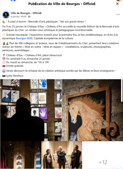 La première restitution du dispositif académique « A pied d’œuvre - biennale d’arts plastiques », édition 2024-2026 se tiendra au Château d’eau Château d’art de Bourges du 09 au 25 janvier 2026. Le vernissage aura lieu jeudi 08 janvier à 18h30.