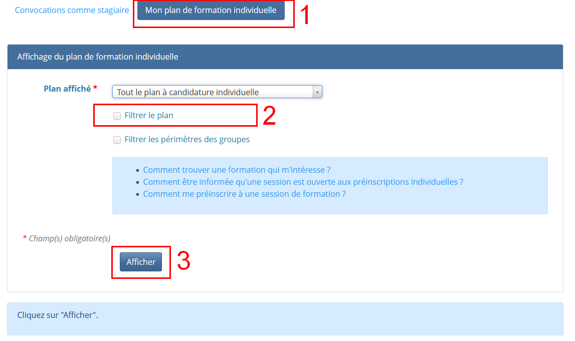 Cliquer sur l’onglet "Mon plan de formation individuelle" puis filtrer votre demande selon vos critères